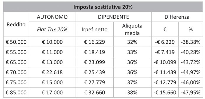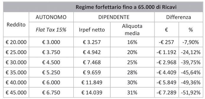 Il regime fiscale forfetario istituito dalla legge di stabilità del 2015 viene ampliato introducendo un’unica soglia di accesso dei compensi/ricavi pari a 65.000 euro, più elevata rispetto a quelle attuali che variano in rapporto al tipo di attività svolta. L’imposta del 15% sostituirà IRAP, IRPEF e addizionali regionali e comunali; inoltre che aderisse al regime forfettario sarà escluso dell’applicazione dell’IVA, dagli studi di settore, dagli ISA (Indici Sintetici di Affidabilità). Nella tabella seguente abbiamo confrontato gli effetti di tale estensione sulla differente imposizione derivante dall’imposta Irpef e relative addizionali a parità di reddito imponibile tra un lavoratore autonomo ed un lavoratore dipendente.